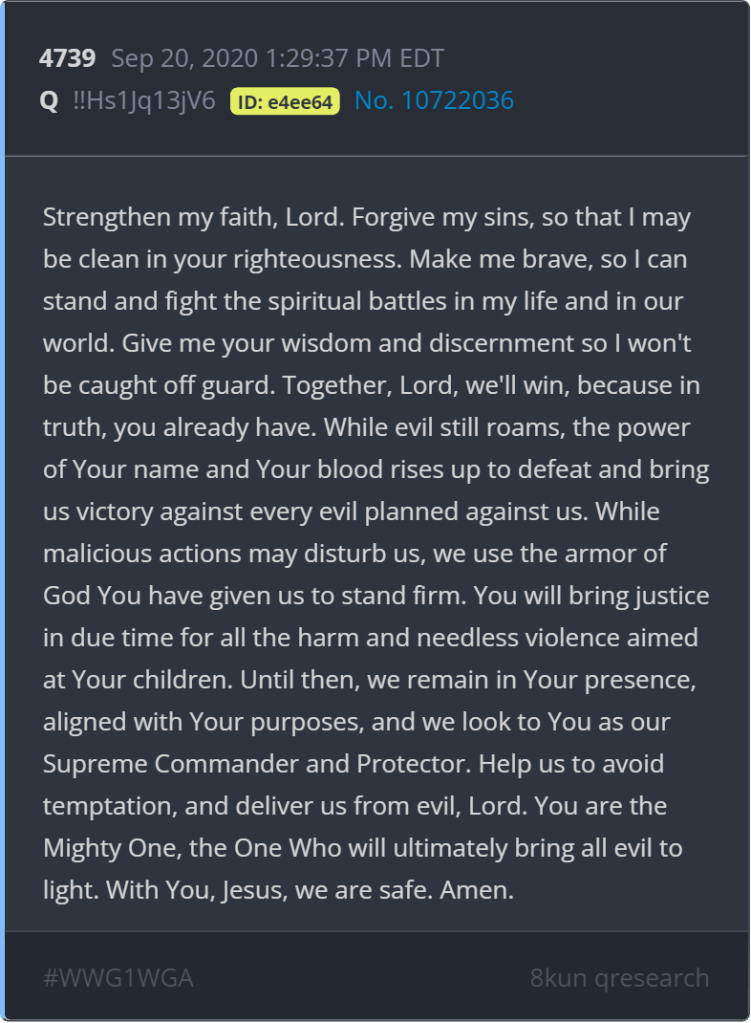 C’est ce jugement sur la valeur sur Q qui non seulement lui permet de gagner la confiance de ses partisans, mais aussi de les rassembler dans un groupe homogène, créant ainsi un sentiment de communauté et d’alliance vers un mal qui est perçu comme commun à tous. Ceci peut être remarqué par l’usage de l’acronyme WWG1WGA (« Where we go one we go all », là où nous sommes un, nous sommes tous). Ce jugement sur la valeur de Q lui permet aussi de continuer dans son discours malgré les erreurs factuelles et logiques.
