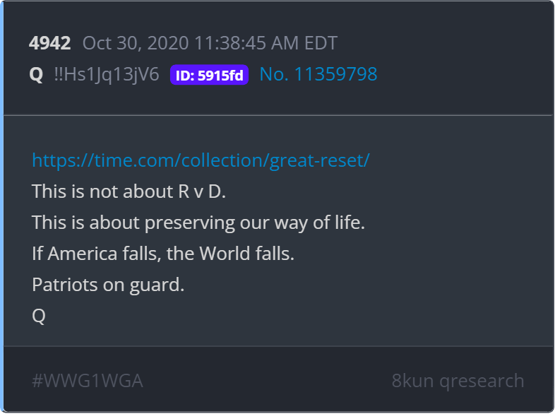 Dans les mois précédant l’assaut du capitole le 6 janvier 2021, Q martelait et faisait écho à la suggestion que les élections seraient frauduleuses et que le « Deep State », le terme qui décrit la machinerie étatique et secrète des agences de renseignement américaines (Cambridge Dictionnary, 2024), travaillait activement pour non seulement prévenir la réélection de Donald Trump, mais aussi, et en même temps, protéger leurs propres intérêts obscurs et sinistres, ceux du Parti démocrate et leurs alliés dans les plus hautes sphères de la société américaine (Publications 4796, 4832 et 4886, (Q Alerts | Intelligence Drops | WWG1WGA, s. d.). Dans les mois et les années qui suivront cette élection, plusieurs investigations et révélations confirmeront ce que le public général savait : il n’y avait jamais eu de fraude électorale (AP News, 2024).