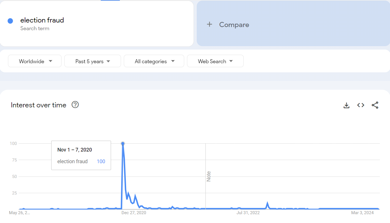 Google Trends. (s. d.-a). Election fraud. Google Trends. Consulté 23 avril 2024, à l’adresse https://trends.google.com/trends/explore?date=today%205-y&q=election%20fraud&hl=en-US