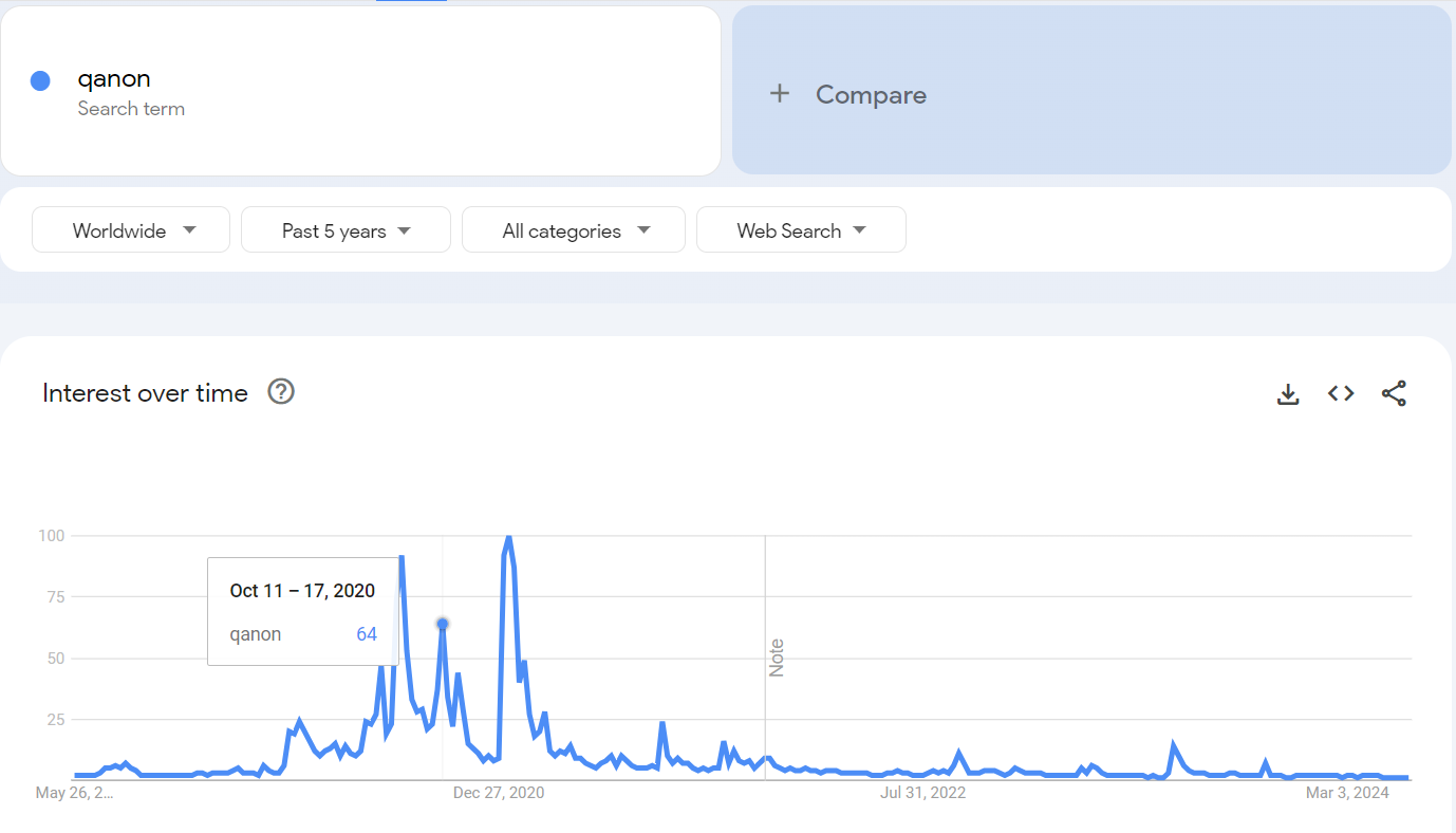 Google Trends. (s. d.-b). Qanon. Google Trends. Consulté 8 avril 2024, à l’adresse https://trends.google.com/trends/explore?date=all&q=qanon&hl=en